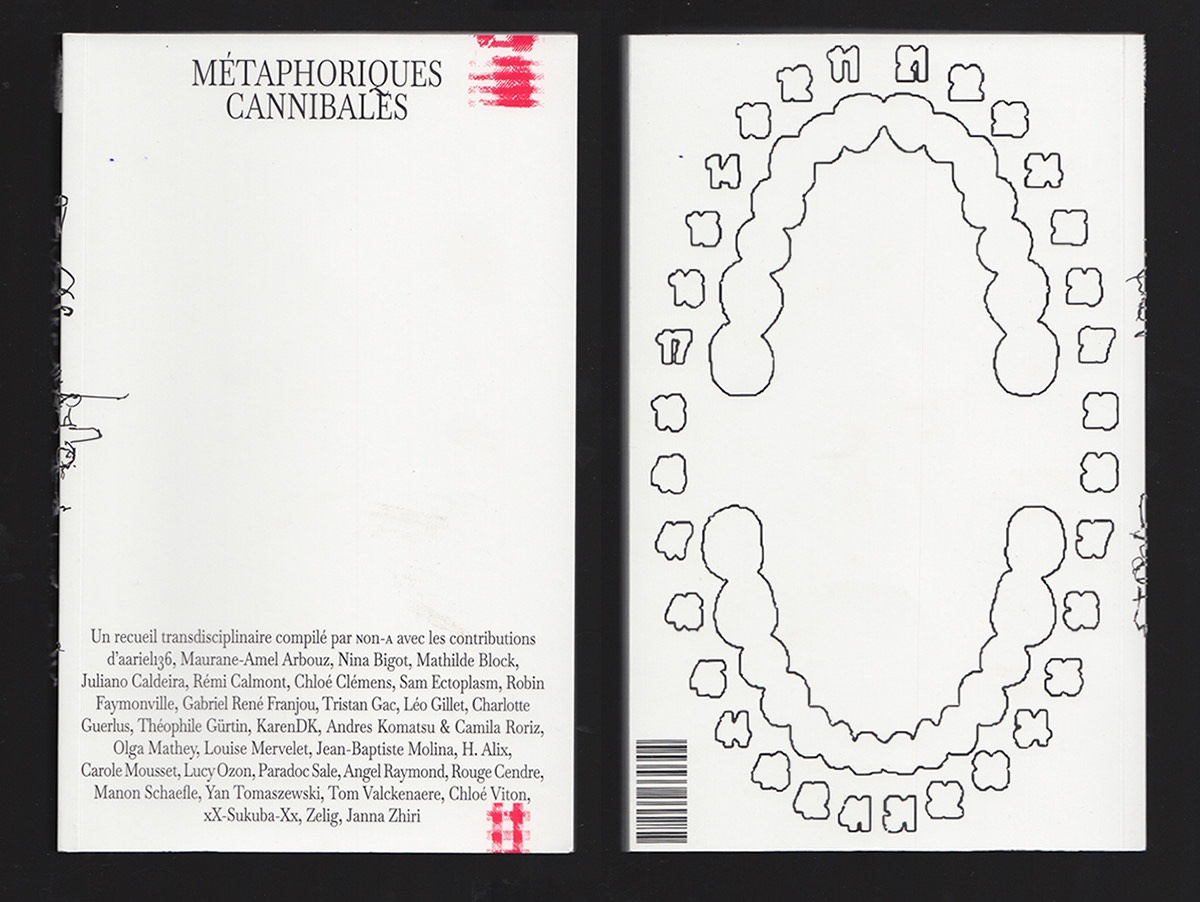 Metaphorical Cannibals is a transdisciplinary collection, where cannibalism is taken as a metaphor, as an open concept for analogies, as anthropopoiesis[1], black box[2], and as a total social fact[3]. Inhabitants of this place are individuals who drink from symbols, imaginaries, occult, intimacy, and do not hesitate to regurgitate images and ideas of extreme violence, paradoxically constituting the universe of their production as a "safe space." The cannibal is a Belgian specialty, composed of a toast covered with "filet américain" (a Belgian variant of steak tartare). Transgressive and provocative, it is a paroxysm of otherness and a fantasy of the Other, allowing us to contemplate ourselves through reflection. Life only has flavor to become meat. Transgression is also going further. Daring to go further. Beyond commonly accepted norms that are all relative and violent. SOFT AND SANGUINE SUBSTANCE We seek speculative tools to think about our world. VISUAL STIMULI HOMOGENIZED BY RED In a polysemic fog filled with chimeras, a taboo pierced with discomfort and anxiety, warm in a belly full of plasma, this transdisciplinary collection is emitted by ɴon-ᴀ. In the wide gap that the opening of our theme offers us, a multitude of approaches rush in: from the ditty to speculative narrative, from critical definition to vorarephilic comic, from photojournalism to experimental poetry, from speculative ecology theory to eroticoccult performance. Let's explore the obscure depths of our ethics to find the foundations of our ontologies... shooting ourselves in the foot. Welcome to the lair of the monster.